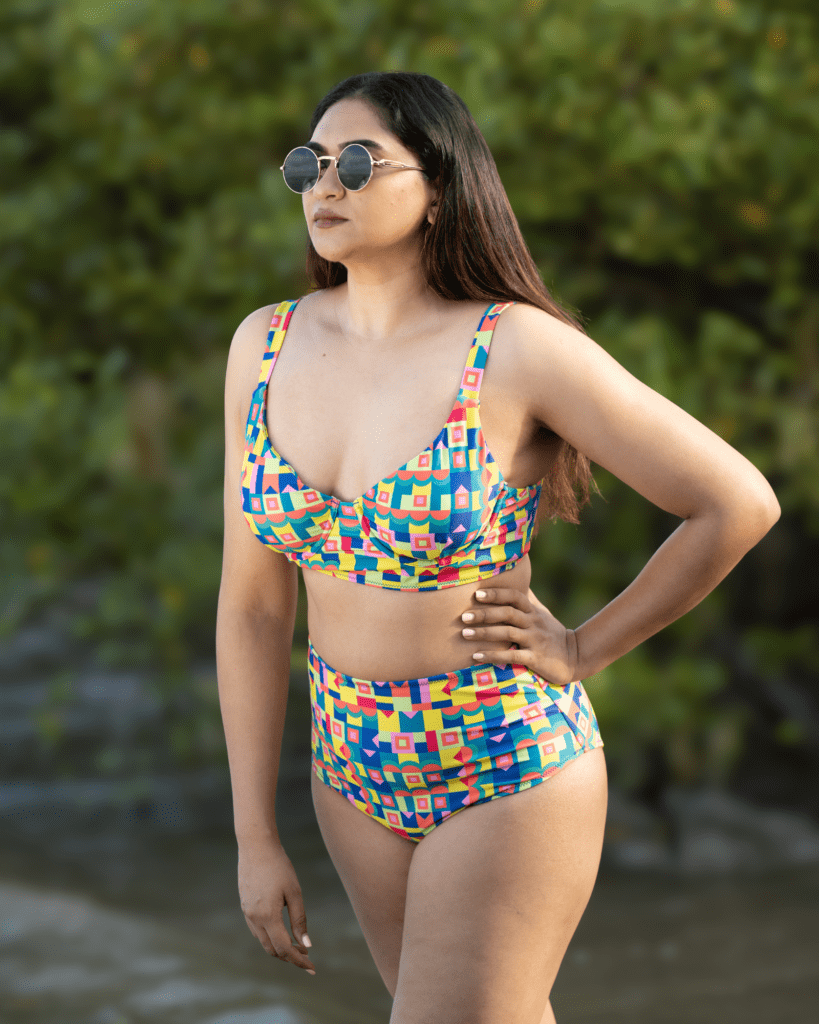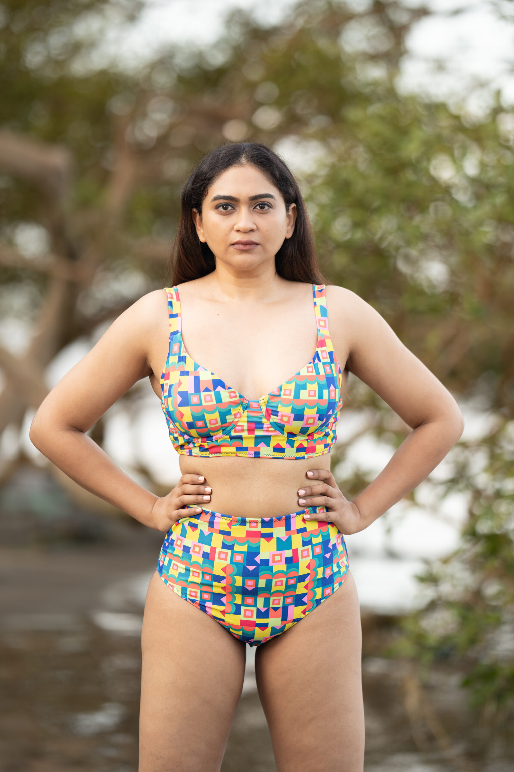 This original Timala Art highwaist bikini pattern is designed by Timala co-founder Achina, our in-house artiste. This print inspired by her painting is sneaky because you think it won’t look good on you and BAM! You’re rocking all the colours in this print. A high-waisted design, underwire top with adjustable straps and hook give all the tribal rani feels! Team it with our cover-up for extra zhuzh! Our Tribal Sun full length coverup compliments this highwaist bikini fabulously.