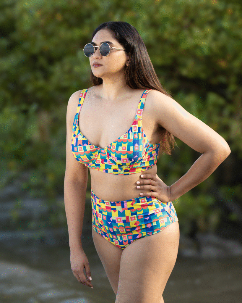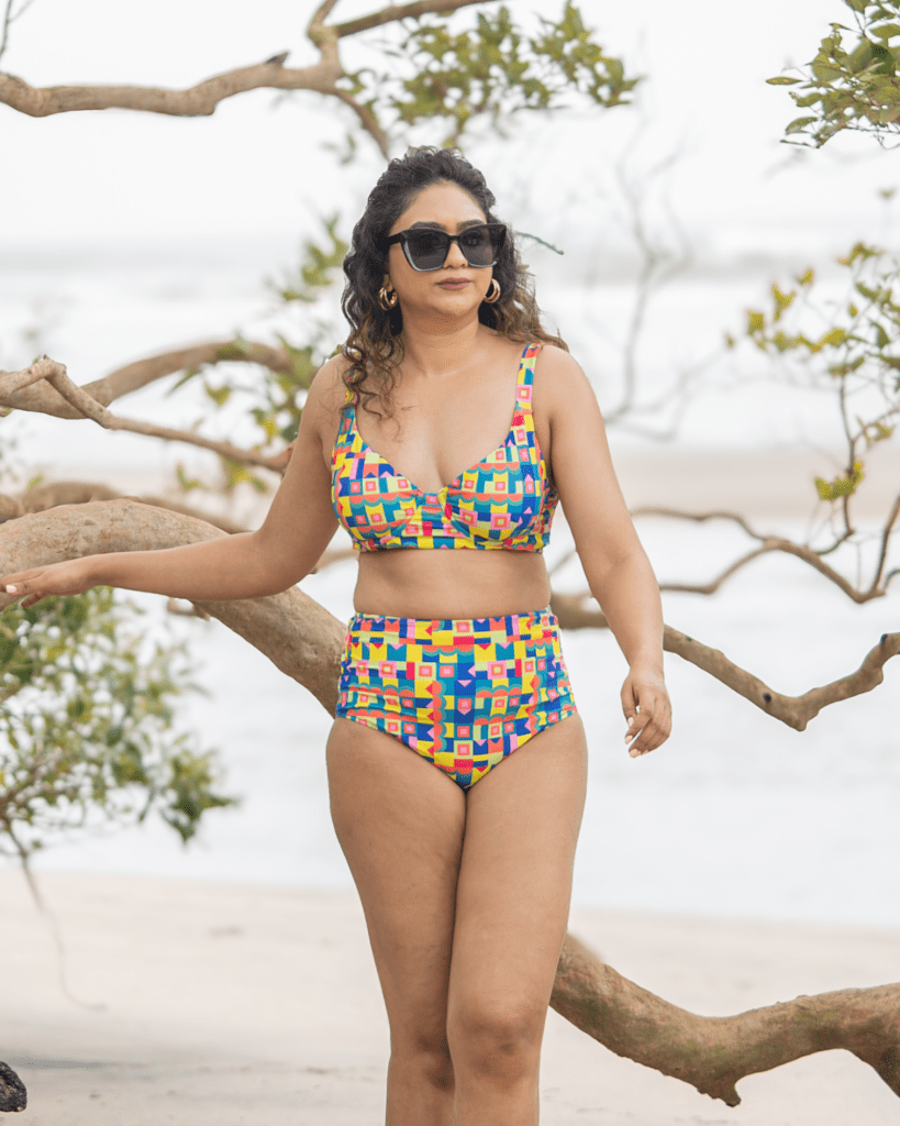 This original Timala Art two piece pattern is designed Timala co-founder Achina, our in-house artiste. This print inspired by her painting is sneaky because you think it won’t look good on you and BAM! You’re rocking all the colours in this print. A high-waisted design, underwire top with adjustable straps and hook give all the tribal rani feels! Team it with our cover-up for extra zhuzh!